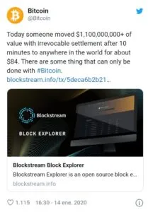 En una reciente publicación en el Twitter oficial de Bitcoin se dió a conocer que se hizo una transacción de más de mil millones de dólares por un costo de 84 dólares y en solamente 10 minutos.
